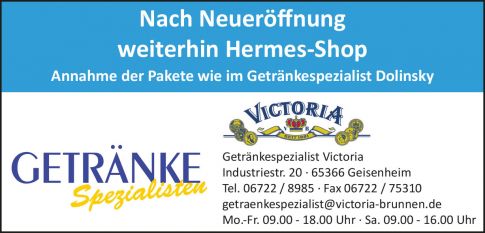 Geöffnet ist der neue Markt des Getränkespezialisten in der Geisenheimer Industriestraße täglich von 9 bis 18 Uhr, Samstag von 9 bis 16 Uhr. Anfragen für Festplanungen sind unter 06722/8985 oder Getraenkepezialist@ victoria-brunnen.de natürlich mit dem nötigen zeitlichen Vorlauf und bei Selbstabholung möglich.
