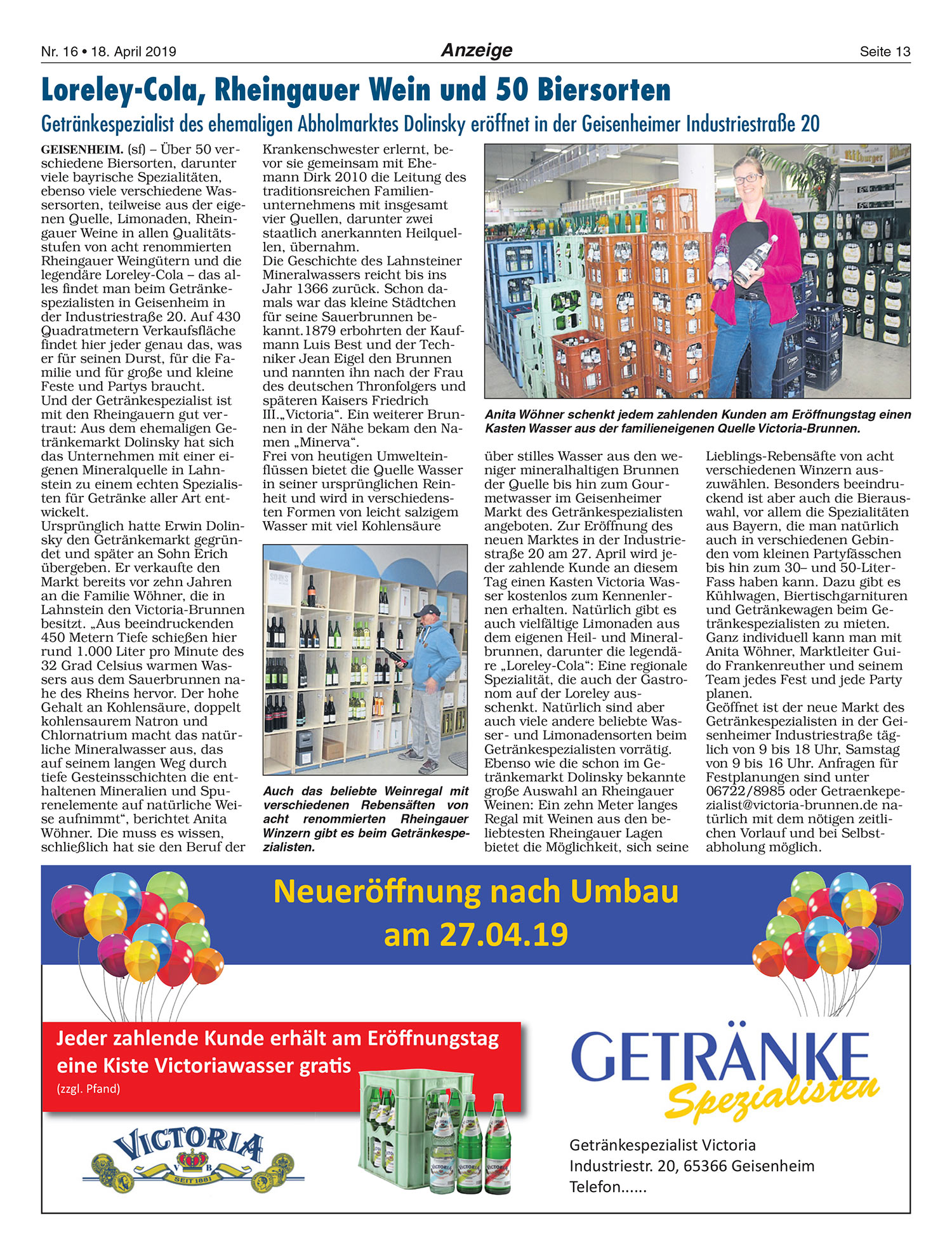 Frei von heutigen Umwelteinflüssen bietet die Quelle Wasser in seiner ursprünglichen Reinheit und wird in verschiedensten Formen von leicht salzigem Wasser mit viel Kohlensäureüber stilles Wasser aus den weniger mineralhaltigen Brunnen der Quelle bis hin zum Gourmetwasser im Geisenheimer Markt des Getränkespezialisten angeboten. Zur Eröffnung des neuen Marktes in der Industriestraße 20 am 27. April wird jeder zahlende Kunde an diesem Tag einen Kasten Victoria Wasser kostenlos zum Kennenlernen erhalten. Natürlich gibt es auch vielfältige Limonaden aus dem eigenen Heil- und Mineralbrunnen, darunter die legendäre „Loreley-Cola“: Eine regionale Spezialität, die auch der Gastronom auf der Loreley ausschenkt. Natürlich sind aber auch viele andere beliebte Wasser- und Limonadensorten beim Getränkespezialisten vorrätig. Ebenso wie die schon im Getränkemarkt Dolinsky bekannte große Auswahl an Rheingauer Weinen: Ein zehn Meter langes Regal mit Weinen aus den beliebtesten Rheingauer Lagen bietet die Möglichkeit, sich seine Lieblings-Rebensäfte von acht verschiedenen Winzern auszuwählen. Besonders beeindruckend ist aber auch die Bierauswahl, vor allem die Spezialitäten aus Bayern, die man natürlich auch in verschiedenen Gebinden vom kleinen Partyfässchen bis hin zum 30– und 50-Liter- Fass haben kann. Dazu gibt es Kühlwagen, Biertischgarnituren und Getränkewagen beim Getränkespezialisten zu mieten. Ganz individuell kann man mit Anita Wöhner, Marktleiter Guido Frankenreuther und seinem Team jedes Fest und jede Party planen.
